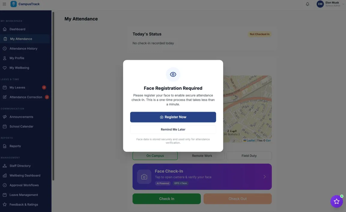 CampusTrack uses phone-based face recognition and GPS geofencing — no fingerprint scanners or hardware installation required.