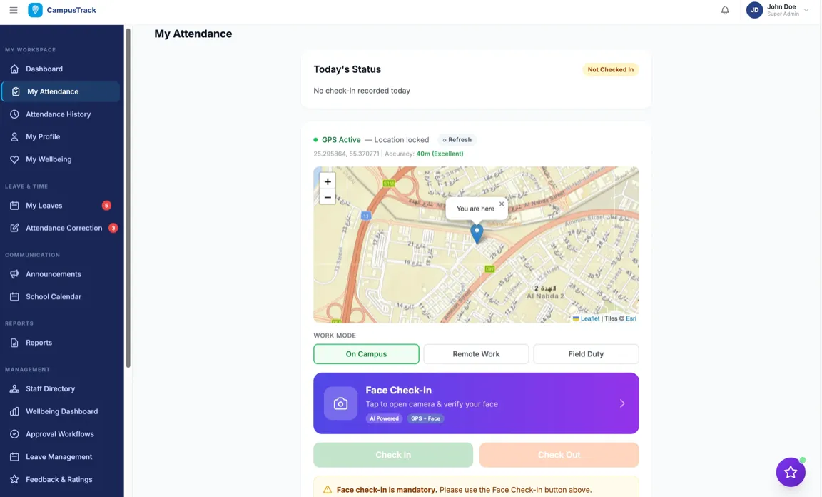 CampusTrack uses configurable geofencing with face recognition for location-verified attendance across any number of sites.