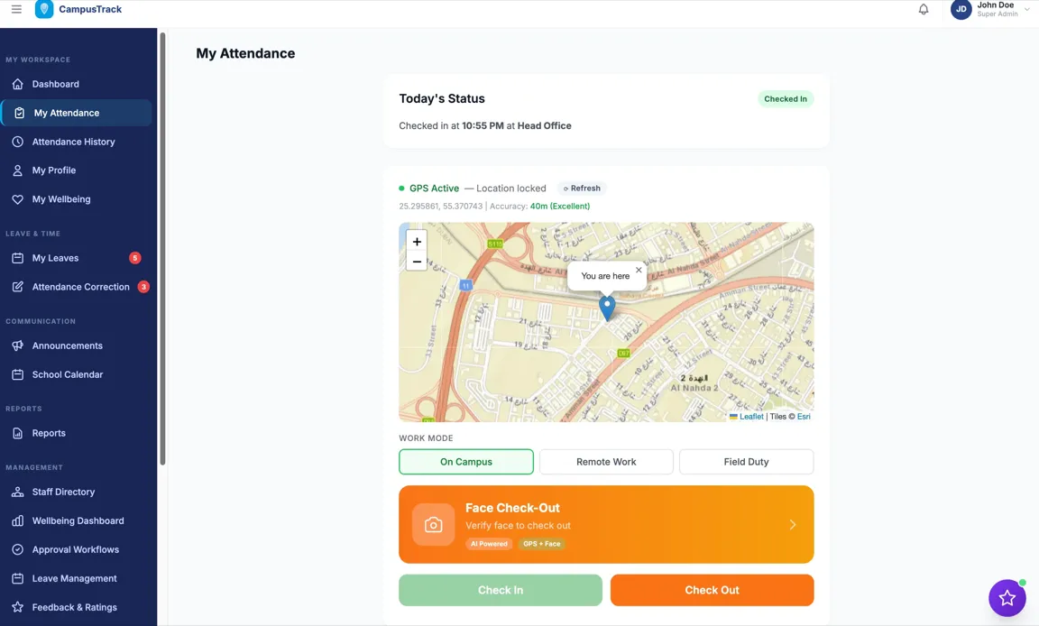 CampusTrack uses GPS geofencing with face recognition to deliver accurate, hardware-free attendance across multiple sites.