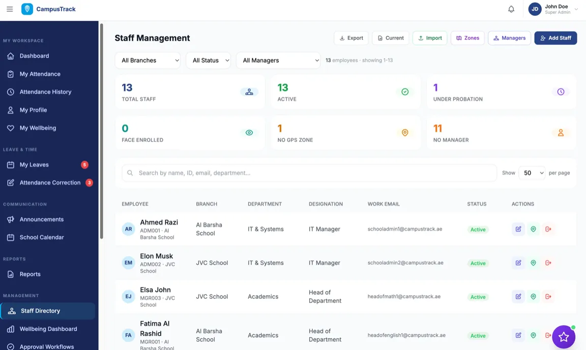 School groups: A Dubai school group operating 4 campuses needs each principal to manage their campus independently while the group director sees consolidated data. See our detailed article on managing staff attendance across multiple school campuses. Teachers assigned to one campus should only check in at that campus. Substitute teachers who move between campuses need flexible assignments. The system must handle different academic calendars if the campuses serve different curricula.
