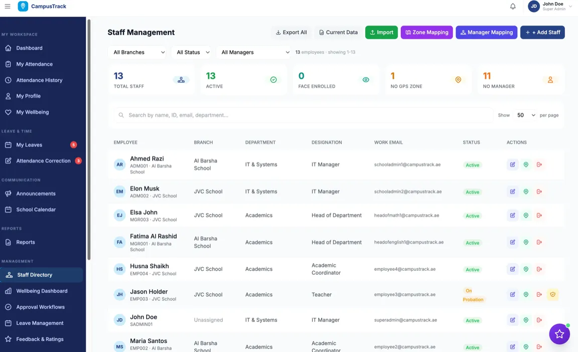 The Ministry of Education (MOE) also sets requirements for staff-to-student ratios and minimum instructional hours. If a school cannot demonstrate accurate teacher attendance records, it may struggle to prove compliance with these standards. Beyond regulatory requirements, school groups operating multiple campuses in Dubai need centralised visibility — knowing which staff are present at which campus, in real time, across the entire group.