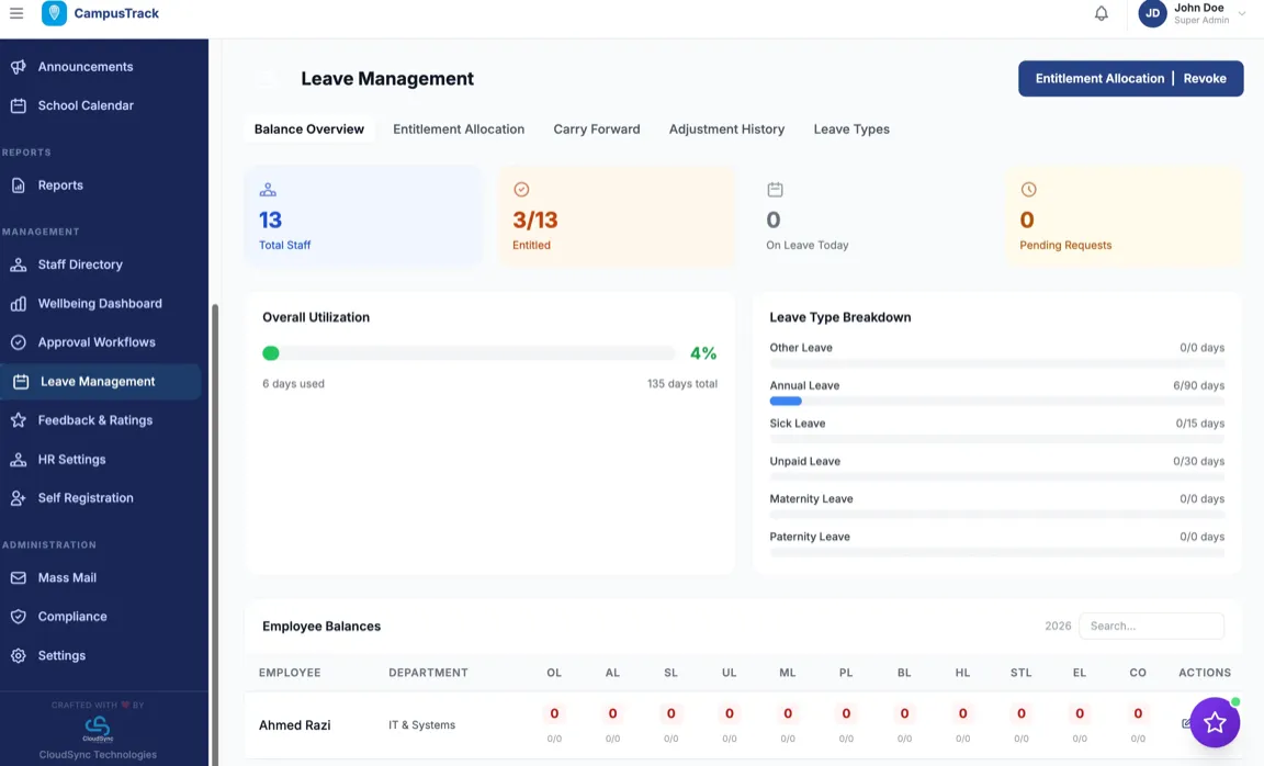 CampusTrack provides automated attendance with overtime tracking, exportable reports, and MOHRE-ready record-keeping.
